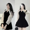 Váy Nhung Nữ Cổ V Dáng Xòe Tiểu Thư Phối Tay Phối Tơ Điệu Đà BigSize MiSoul, Đầm Thiết Kế Dáng Ngắn Cổ Bẻ 364